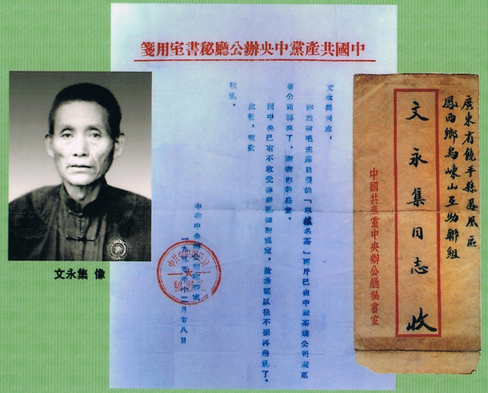 同年12月28日,中共中央办公厅秘书室复信,信的全文:“文永集同志:你送给毛主席自制的(单丛名茶)两斤已由中国茶叶公司广东省公司转来了,谢谢你的盛意。因中央已有不收受群众礼物的规定,故希望以后不要再送礼了。”