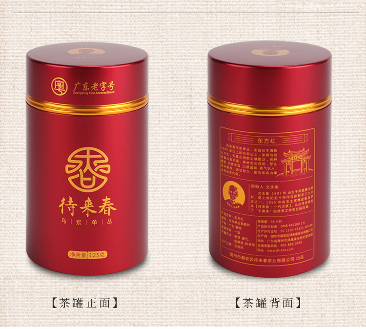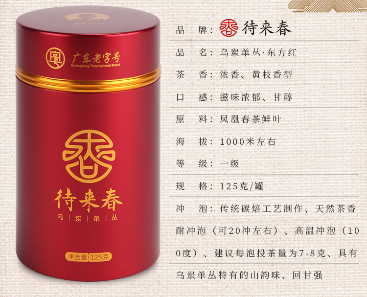 产品描述:东方红单丛茶叶,茶树位于海拔1200米以上的乌岽山上,树龄在百年以上,条索紧实沉重,色泽乌褐油润,汤色金黄,香气浓郁,味道甘醇,回甘力极强。